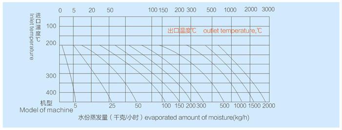 水份蒸發(fā)量與物料的特性及熱進(jìn)風(fēng)、出口溫度相關(guān)。當(dāng)出口溫度為90oC,其水份蒸發(fā)曲線見上圖(供選型參考),隨著產(chǎn)品不斷更新,有關(guān)參數(shù)變更,恕不預(yù)先通知。