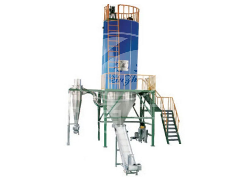 潔凈空氣加熱后進(jìn)入干燥塔,在塔內(nèi)熱風(fēng)中用二流體(或三流體)噴嘴將各種料液物化成微小液滴,與熱風(fēng)進(jìn)行快速熱交換,蒸發(fā)掉液料中的水份(或溶劑),并隨熱風(fēng)排出,得到粉狀產(chǎn)品。